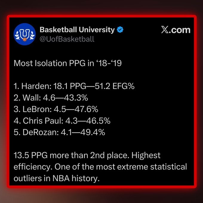 对此火箭媒体人Bradeaux列出18-19赛季哈登的单打数据,表示:“毫无疑问是哈登。”