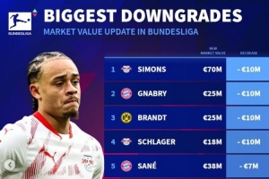 德甲身价贬值榜:西蒙斯&格纳布里下跌1000万,萨内&聚勒降700万